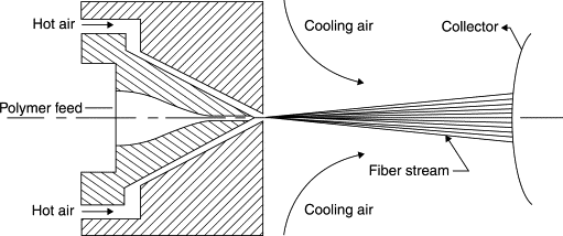 The key to the melt blowing process is the spin head. The basic principle is the extrusion of low viscosity polymer melt through a single row of very fine holes placed close together in the order of 1000–4000 holes per m. These holes are usually drilled or made by fusing together two plates that contain etched channels. High velocity hot air is blown at the exit of the holes from both sides of the row of holes at an angle. This air keeps the molten polymer hot and attenuates the molten polymer into a fine fiber. At the same time a flutter is developed in the air stream that causes the fibers to flap rapidly back and forth as they are cooled by ambient air becoming entrained in the process. Finally the fibers are collected on a screen belt or drum.